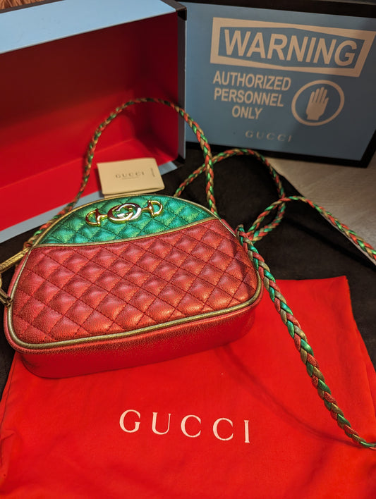 Gucci Trapuntata Quilted Metallic Calfskin Leather Crossbody Bag. Red, Gold, Green.